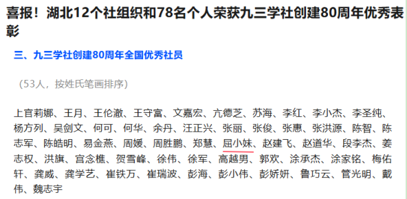 本网讯 近日,在庆祝九三学社创建80周年之际,九三学社中央表彰了一批全国优秀省级组织、全国优秀基层组织、全国优秀社员和全国优秀社务工作者。我校九三学社委员会主委、学报编辑部副主编屈小妹荣获“全国优秀社员”称号,成为我省获此殊荣的优秀代表之一。