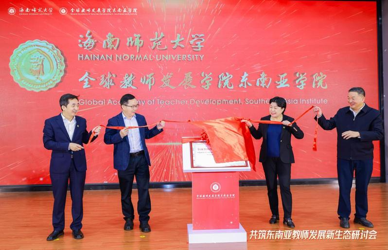 会议期间,雷儒金与海南省教育厅副厅长陈振华,海南师范大学党委书记许玫、校长聂清斌共同为全球教师发展学院东南亚学院揭牌。