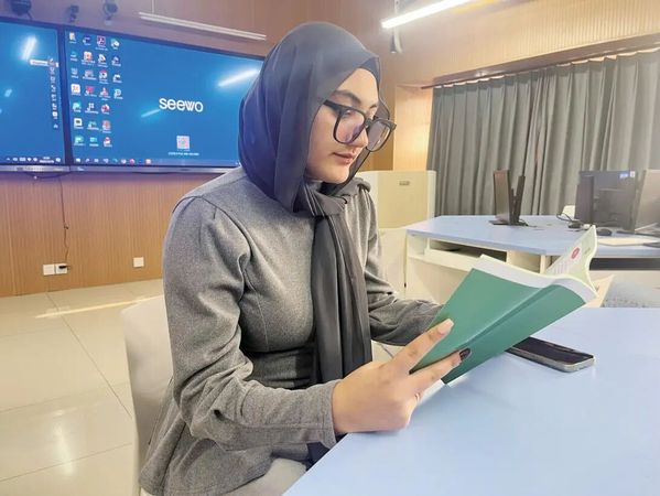 在湖北师范大学国际教育学院的一间教室里,阳光透过窗户洒在书桌上。17岁的阿尔及利亚留学生刘心冉(Lydia)正在专注地阅读一本《实用汉语教程》。