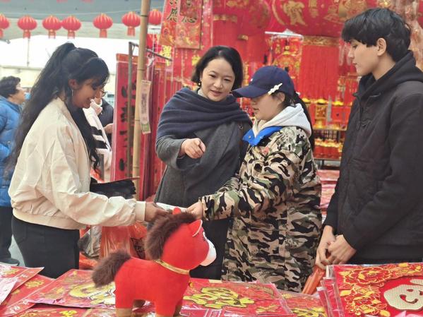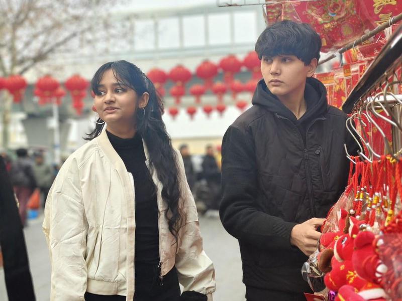 在新春饰品摊位前,红彤彤的春联、憨态可掬的马年生肖挂饰让两人挪不开脚步。朱轶介绍,春联是中国人过年的经典装饰,贴在门上寓意辞旧迎新、吉祥如意,小马挂饰则因明年是马年,饱含着新年的美好期许。