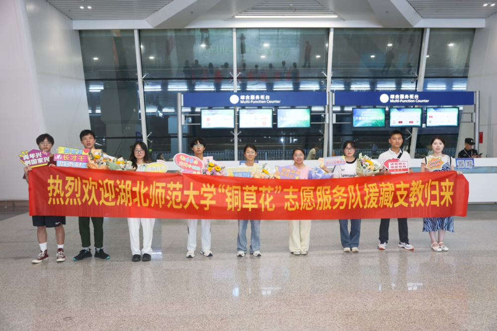 近日,圆满完成援藏支教任务的湖北师范大学“铜草花”志愿服务队回到黄石,湖北师大师生代表赴机场迎接。