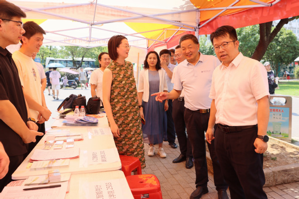 本网讯 9月5日上午,校党委书记李宏,校长雷儒金,纪委书记陆咏梅,党委副书记余涛,副校长胡艳军,党委常委肖六亿及相关单位负责人,深入2025级新生报到各迎新点,实地检查指导迎新工作,亲切看望慰问奋战在一线的师生员工与志愿者,为新同学送上学校的关怀与祝福。
