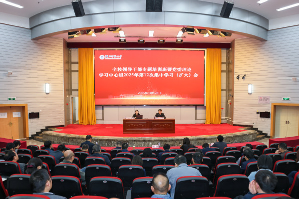 本网讯 10月28日下午,学校在教育大楼报告厅举行全校领导干部专题培训班暨党委理论学习中心组2025年第12次集中学习(扩大)会,湖北省委党校副校长唐岚教授应邀来校作专题辅导报告。全体校领导,全校副处级及以上干部参加学习。报告会由校党委书记李宏主持。
