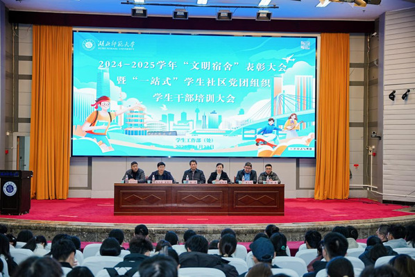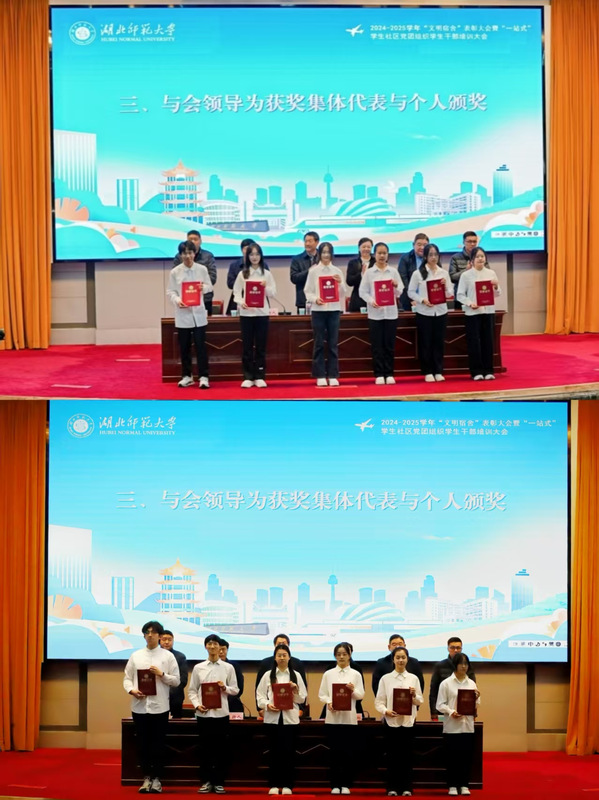 组织部副部长杨娇宣读《关于表彰2024-2025学年“文明宿舍”的决定》和《关于表彰2024-2025学年“一站式”学生社区“优秀学生干部”的决定》。与会领导为获奖集体与个人颁奖,勉励他们珍惜荣誉,再接再厉,持续发挥模范带头作用。