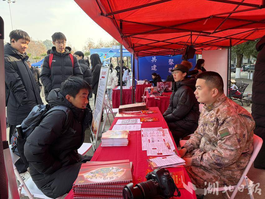 “同学们,投身军营不仅是一份荣耀,更是提升自我、规划未来的宝贵机会!”12月25日上午,湖北师范大学冬季综合类招聘会现场人头攒动,一个特别的展位前格外热闹——该校武装部创新宣传形式,将征兵咨询点“搬”进招聘会场,并特邀黄石港区人民武装部参谋熊琦到场,为学子们详解征兵政策,提供“一对一”专属咨询服务。