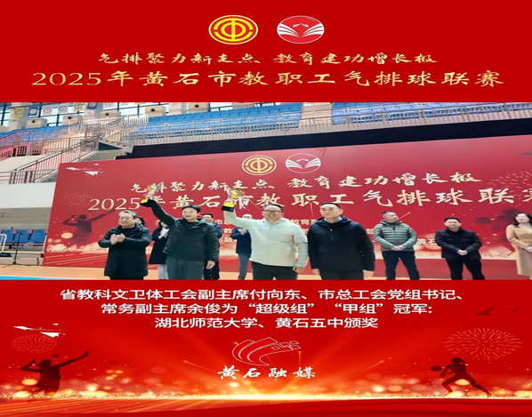 本网讯 1月18日,“气排聚力新支点,教育建功增长极”2025年黄石市教职工气排球联赛第二阶段竞赛在湖北师范大学附属中学(黄石市第一中学)举行。我校教工队勇夺“超级组”冠军,省教科文卫体工会副主席付向东为学校颁奖。