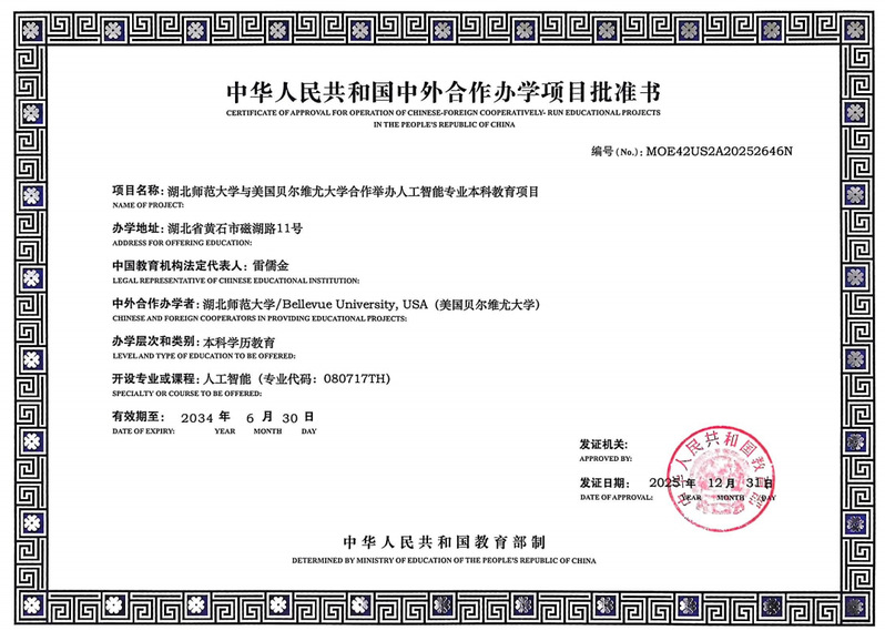 本网讯 近日,教育部正式批准我校与美国贝尔维尤大学合作举办人工智能专业本科教育项目(批准书编号:MOE42US2A20252646N)。该项目是我校获批的第二个本科层次中外合作办学项目,标志着我校教育对外开放与国际化办学水平迈上新台阶。