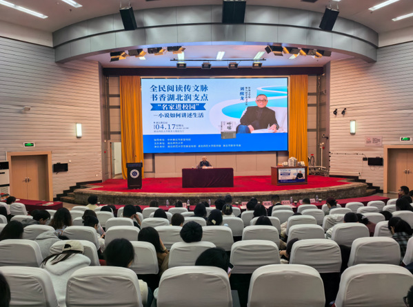 4月17日上午,2026年“全民阅读传文脉 书香湖北润支点”名家进校园活动在湖北师范大学教育大楼报告厅圆满举行。茅盾文学奖得主、著名作家刘醒龙受邀开讲,带着其最新作品《听漏》与400余名师生共话文学与生活。