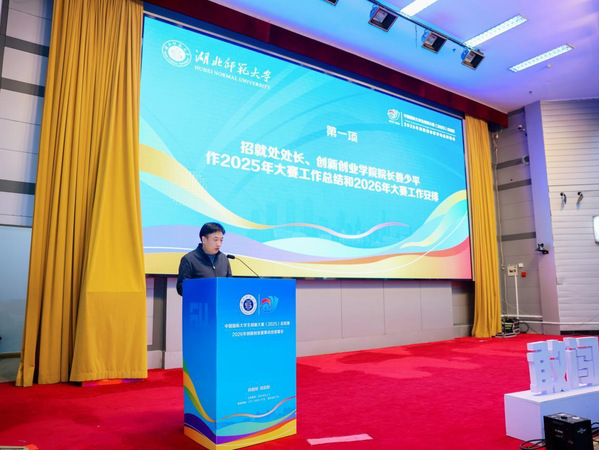 近日,湖北师范大学“中国国际大学生创新大赛(2025)总结暨2026年创新创业赛事动员部署会”在湖北师范大学教育大楼学术报告厅隆重召开,同期拉开第三届双创嘉年华活动序幕。校党委副书记、校长雷儒金,党委副书记、副校长余涛,黄石市教育局、科技局、人力资源和社会保障局相关领导、优秀校友企业家代表、湖北师范大学相关职能部门及二级学院负责人、获奖师生代表等齐聚一堂,共话双创教育发展,共启赛事新篇章。