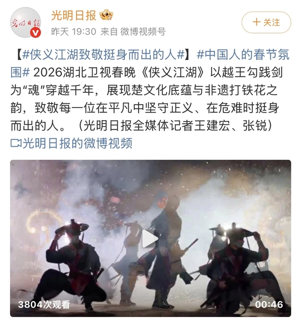 从博物馆的千年古剑,到春晚舞台的鲜活演绎,再到江城夜空的璀璨光剑,《侠义江湖》完成了一次穿越千年的精神传递。这把剑,从属于越王勾践的青铜名器,慢慢变成了每一个在生活中千锤百炼、勇于担当的普通人的精神象征。作为湖北卫视深耕荆楚文化、探索传统文化现代表达的一次用心实践,《侠义江湖》让千年侠义精神在烟火人间落地生根,也让更多人读懂:所谓侠义江湖,从来都是平凡人的挺身而出;所谓英雄土地,不过是让平凡人在磨砺中闪光的地方,而每一个不肯低头、心怀担当的普通人,都是这个时代最好的执剑人。